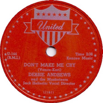 Above Left: Label image of United U-144 recorded on January 15, 1953 and released in March of that year. This was the first of two releases by Debbie Andrews on Chicago's United label, both in 1953. She had one prior record on Mercury, recorded in 1949, but not released until 1952. Of her three releases, United U-144 is the only one with vocal group backing. NOTE: The correct spelling for the "Vocal Director" shown on the label is "Jack Halloran."Co-writer for the above shown side, Sax Kari, also composed "Please Wait For Me" for Debbie's second release on the United label. Kari was a band leader who, in addition to composing duties, had some releases on United, mostly with vocals by Gloria Irving. BMI credits Kari with 509 compositions, but does not show that "Vance" was involved with "Don't Make Me Cry." (Could this have been Tony Vance, the a.&r. man mentioned below?) "Parker-Vance" are shown as composers on the flip side.