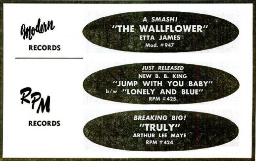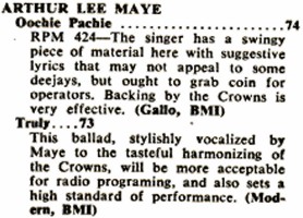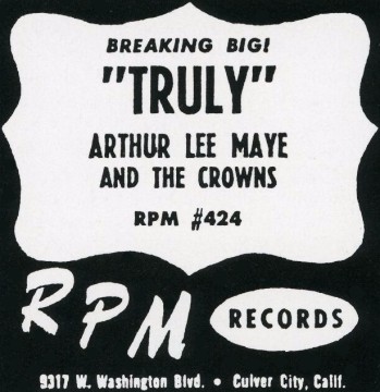 Above: (Left) Clipping from May 1955. (Right) Label image of RPM 424 released in February 1955. Richard Berry has composer credit on "Truly" as does Johnny Otis on the flip side. Arthur Lee Maye And The Crowns had releases on Flair (1954-55), Modern (1954), RPM (1955), Specialty (1956), Dig (1956), Flip (1957), and Cash (1958).Trade Magazine Clipping: March 1955—Lots of activity on the Modern label waxing of "Truly" by Arthur Lee Maye, the bonus baseball player for the Milwaukee Braves (now in spring training). Disk is showing development of embryonic muscles and will soon be covered in the pop field by Dot, Essex, Decca and others....