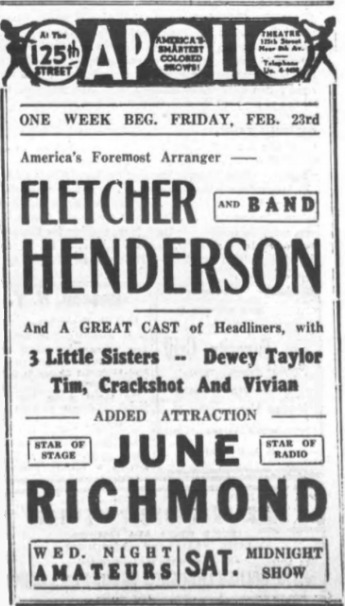 Afro-American Newspaper (April 8, 1939): ....The Cotton Club Caravan brings direct from the famed New York club, June Richmond, noted star of Broadway and former featured vocalist with the great Tommy Dorsey and Cab Calloway bands....