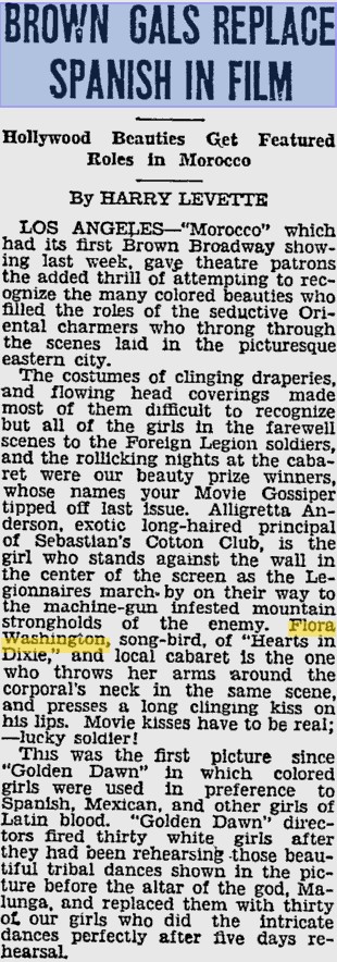 Above: Flora Washington. From Pittsburgh Courier Newspaper dated 2/23/35. "Vivacious Flora Washington, motion picture actress and popular in Los Angeles, who recently returned from the famous 'Little Club' in Shanghai, China."NOTE: Flora, along with her sister, Mildred, starred in the 1928 movie "Tenderfeet." She also had a bit part in the 1930 movie "Morocco."