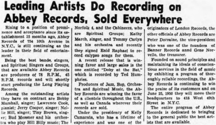 Above: Article about Abbey Records from the New York Age newspaper dated 6/10/50. It has a very favorable promotional slant, as if submitted by Abbey Records themselves. In fairness, the label was doing quite well at the time.Abbey Records existed from late 1948 to late 1952. Peter Doraine was the founder, owner and president. Per an article in The Billboard dated 5/6/50: "....Camarata, who recently left a sales and promotion post with London Records, has bought into Abbey Records. Camarata will serve as vee-pee in charge of sales and promotion.... Abbey (is) under the helm of Pete Doraine...."