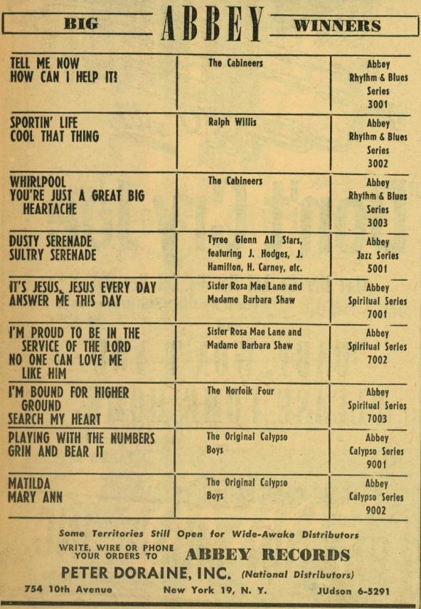 Above: Clipping from The Billboard dated 10/1/49. At this point, Abbey had separated its catalog, and numbering system, into Rhythm And Blues, Jazz, Spiritual, and Calypso series. Country and western ("hill billy") releases came in after the numbering system changed over to the 15000 series.