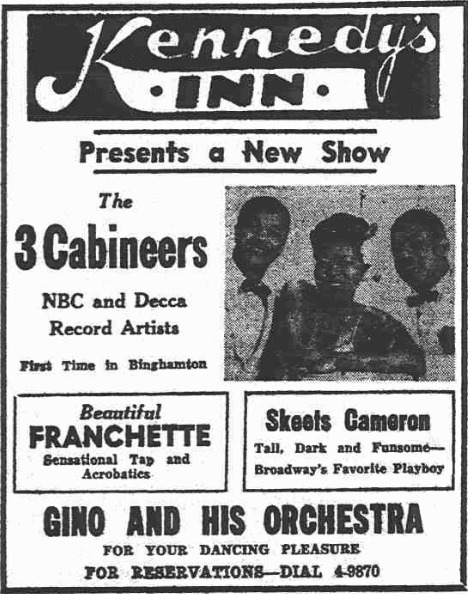 Above: Clipping from the Binghamton Press dated 12/2/47 for "The 3 Cabineers" appearing at Kennedy's Inn in Binghamton, NY. Shown in the picture are (L-R) Bill Westbrook, Maggie Furman and Count Cablo.