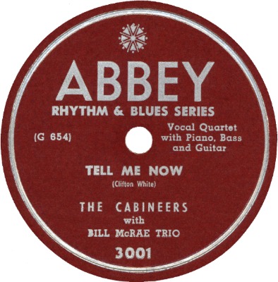 (NOTE: Ted McRae is composer of The Masterkeys' "Mr. Blues." The Bill McRae [possibly related?] Trio provide instrumental backing for The Cabineers on Abbey 3001 and 3003.)- Rudy Toombs is head of artists-repertoire for Abbey Records in May 1950.