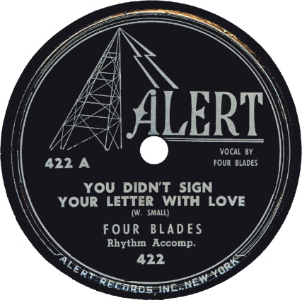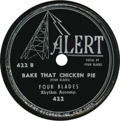 Above: Label images of Alert 422. Note the change to a single tower label design. It is the first of two sequential records by The Four Blades, both on the Alert label (1948). "You Didn't Sign..." is the only song credited to Withbourne A. Small in the BMI repertoire.Quote (from "Bake That Chicken Pie"): "What's your favorite dish? Neck bones is mine."