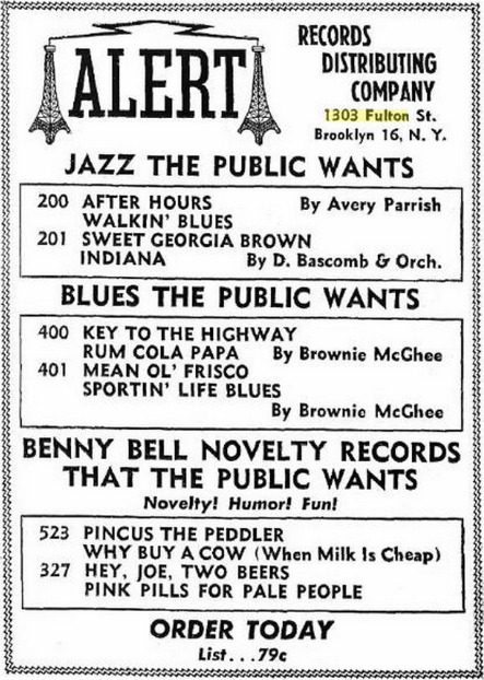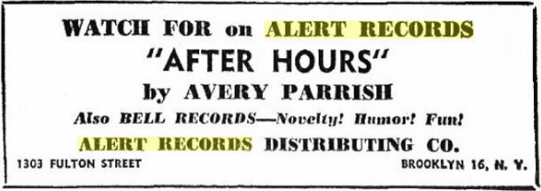 Above: Alert Records advertisement from The Billboard dated 5/25/46. Alert Records, Inc., located in Brooklyn, NY, existed from 1946 to 1950. It was owned and operated by Solly Abrams. There was a 200 series (jazz), 400 series (blues) and 600 series (spirituals). Some of its featured artists were Avery Parrish, Brownie McGhee, Dud Bascomb, Champion Jack Dupree, and The Four Blades. Dud's orchestra included Tiny Grimes on guitar, Paul Bascomb on tenor sax and "Big Sid" Catlett on drums.In 1948, Alert started a children's records line on their Kiddie Time label, which was sold to Jubilee Records in 1949.