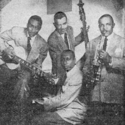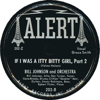 Above Top: Label image of Alert 202 released sometime in 1946. Grace Smith followed with two releases on the National label in 1948. Velma Nelson, who is credited as composer, had the original version of "Itty Bitty Girl, Parts I & II," released on Aladdin in mid-1946.Above Bottom: 1946 photo of Bill Johnson's Musical Notes (L-R) Clifton "Skeeter" Best (guitar), Jimmy Robinson (Bass fiddle), Egbert Victor (piano), and Bill Johnson (alto sax). The above label also credits Ray Turner (tenor sax) and Gene Brooks (drums).