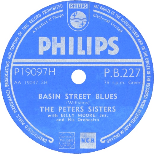 Above: Label image of Philips P.B. 227 released in 1954. This record was "Made in England." This is the only record by The Peters Sisters on the Philips label. Philips released songs, mainly from the American Columbia label, in England and the European continent. No evidence was found that this record was released in the USA on Columbia or any other label.