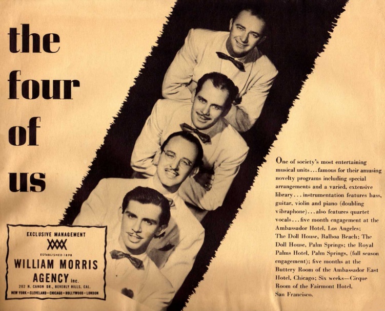 LOS ANGELES TIMES, December 5, 1950: ....In the La Quinta Hotel's new Mirage Room....that musical group, "The Four Of Us", is providing the dance music....Incidentally, you should hear some of their novelty numbers. A band with a wacky sense of humor....