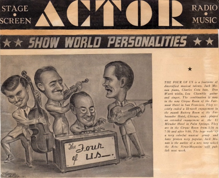 Above: The Four Of Us in caricature (L-R) Charles Cota, Don Worth, Jack Monan, and Lou Chambliss.CAPTION: The Four Of Us is a foursome of diversified talents. Jack Monan piano, Charles Cota bass, Don Worth violin, Lou Chambliss guitar and singer. The combination is now in the Fairmont Hotel in San Francisco. They recently ended a 22-week engagement in the swank Buttery Room of the Ambassador Hotel, Chicago, and played an extended engagement at the El Mirador Hotel in Palm Springs. They are in the Cirque Room from 5:30 to 7:30 and after 9:00. The boys make up a very colorful musical group and have proven very popular. Jack Monan is the author of a new tune which the Actor News-Magazine will publish next week.