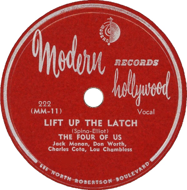 Above: Label image of Modern Records 222 released in 1951. The label conveniently gives the group personnel as "Jack Monan, Don Worth, Charles Cota, Lou Chambliss".The composers on the above "Lift Up The Latch" label are shown as "Spina-Elliot. The composers shown on the flip "Be Mine" label are Lucraft-Jacobson. However, in actuality, Howard Lucraft and Lew Jacobson composed "Lift Up The Latch" copyrighted in 1951 and Harold Spina and Jack Elliott composed "Be Mine" copyrighted in 1950. Modern Records had the credits backwards. As the songs were copyrighted in 1950-1951, it's reasonable to conclude these sides were recorded in 1951.