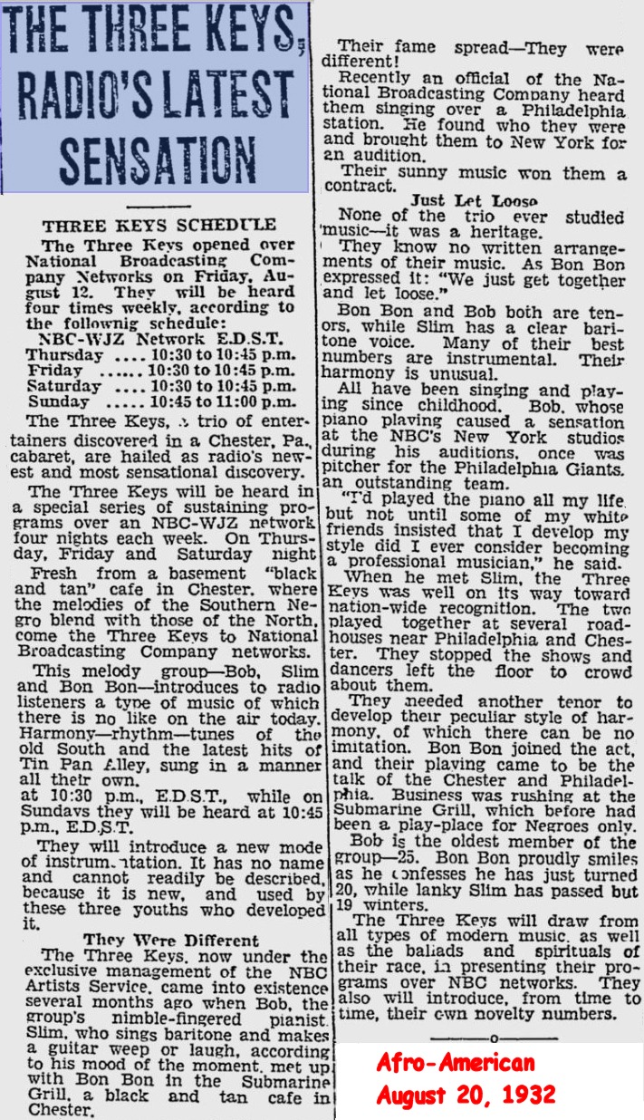 1. Pittsburgh Courier (8/27/32)—DETROIT-The Mills Brothers and now the Three Keys are bidding for fame and fortune in radioland. Detroiters Friday heard Bon Bon, Slim and Bob Keys [sic] over station WJR in their NBC debut and liked 'em. They promise another sensation in radio entertainment. The trio comes to Detroit via the air by the way of a basement cafe in Chester, Pa.