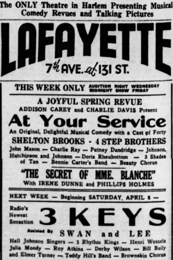 6. Pittsburgh Courier (3/4/33)—Closing a week's return engagement at the Harlem Opera House, Saturday night, Three Keys played to capacity crowds all week. They sang new arrangements that pleased. Judging from their second reception these singers have lost none of their popularity with Harlem audiences.