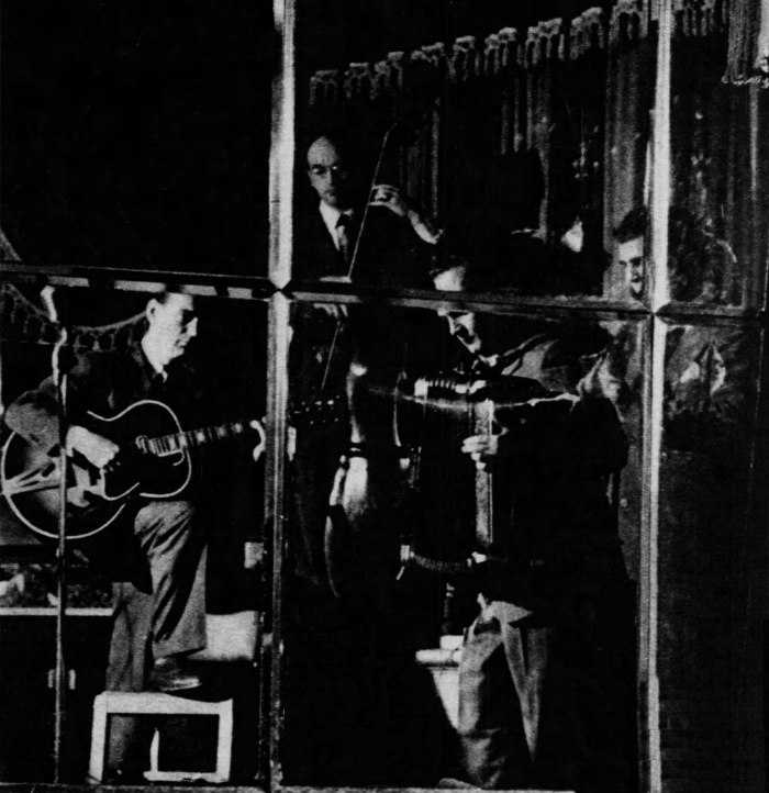 Above: The Joe Mooney Quartet consisting of Joe Mooney (accordian, piano), Jack Hotop (guitar), Gate Frega (bass fiddle), and Andy Fitzgerald (clarinet). Mooney, who was blind, was the leader, arranger and main singer for the group. Here they are performing at Dixon's on 42nd Street in New York City in February 1947.When they came on the scene in 1946, they became very popular quickly, lasted for a few years and then broke up when Fitzgerald left the music business and Frega quit to enter the ministry.