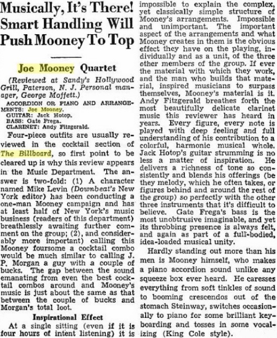 St. Louis Post Dispatch, June 4, 1947: The Joe Mooney Quartet, great musical organization currently appearing here, pairs "I Can't Get Up The Nerve To Kiss You" and "Meet Me At No Special Place" (Decca). Tunes are a bit late, but the Mooney touch is fresh and alive. Joe sings them both, adding humor to his jazz style. Catch that tricky little figure Clarinetist Andy Fitzgerald and Guitarist Jack Hotop use on the first one. Mooney plays accordian. (Please, Joe, the piano on some of your future releases.)