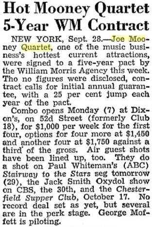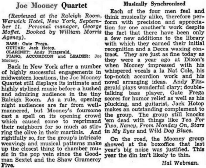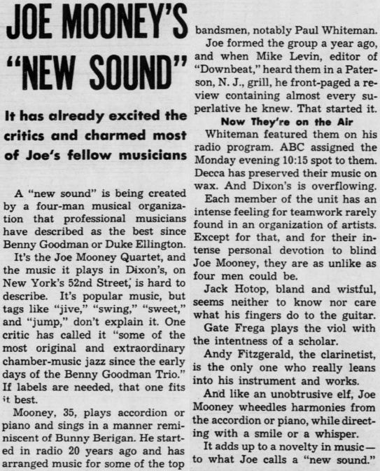 Above: From The Billboard dated 2/1/47. The Joe Mooney Quartet had five records released on Decca (January 1947-January 1949). The first eight released sides were also re-issued by Decca as an album in late 1948.St. Louis Post Dispatch, December 18, 1946: The Joe Mooney Quartet may be the recording catch of the year. At least Decca hopes so, after inking the group in spirited bidding. This combo, now playing in New York, has been heralded by some as the brightest things to hit jazz since Ellington. Others say the King Cole Trio. Its first Decca sides, being released shortly, are "September Song," sung by Mooney in the hushed manner of King Cole but other ideas of his own, and "Just A Gigolo," with the others assisting Mooney on the vocal. This group has progressive ideas and keeps them fresh and alive. Records will play a big part in selling its music to those who can't hear in person.