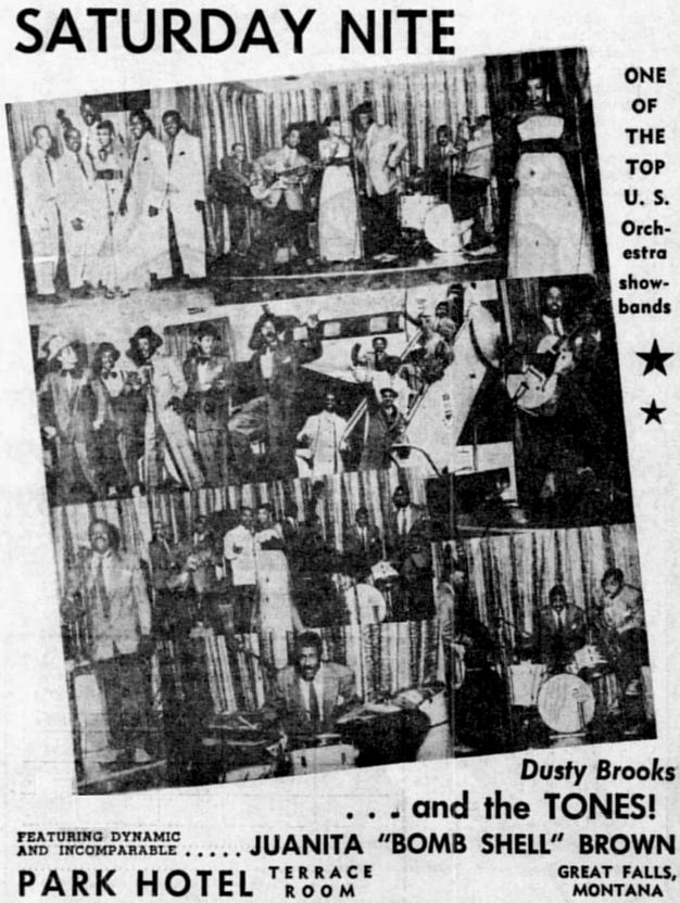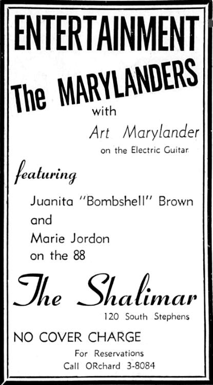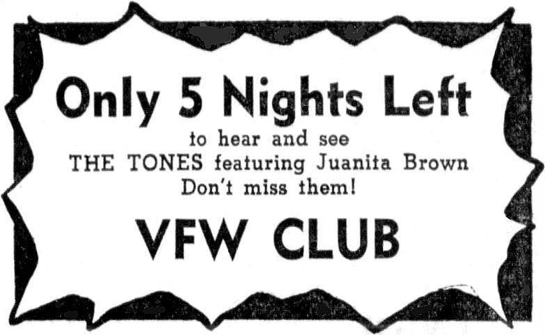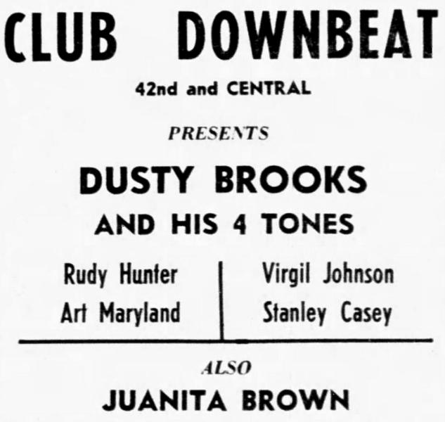 Juanita Brown was a singer known as the "Bomb Shell", "Torpedo Of Toledo", "Queen Of Song", and "Brown Bombshell". After a couple of years as a solo performer, she joined Dusty Brooks And The Four Tones in 1949 and stayed with them until 1954. However, newspaper clippings from January 1955 show her with "The Tones" without mention of Dusty Brooks (although a picture of them includes Dusty). Clippings from February 1955 have Juanita performing with Art Maryland's Marylanders. Art Maryland had been the Four Tones' guitarist for many years. In October 1955, she is featured with The Maryland Trio, again with Art Maryland. However, it seems that after that came obscurity.