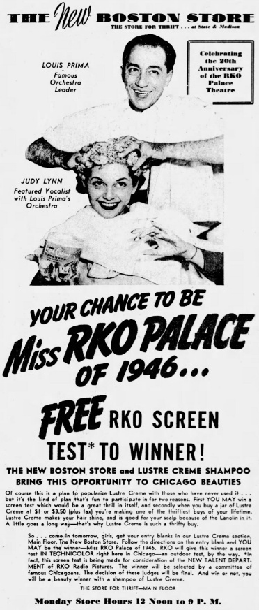 Judy Lynn is vocalist with the Italian jazz master, Louis Prima and his orchestra, at the Circle opening Thursday.Above Middle: CHICAGO TRIBUNE, September 15, 1946: PRIMA'S VOCALIST