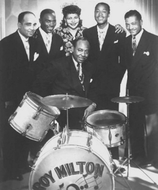 Above: Two photos of Roy Milton And His Solid Senders. They appear to be from the same session. Milton is at the drums. Camille Howard is the piano player. Dr. Barnwell's uncle, David Robinson, is the bass player. As shown in the first two parts of this article, Roy Milton, along with Camille Howard, were a huge part of Art Rupe's early success in the record business. They continued as one of the top consistent moneymakers on Rupe's Specialty Records through the label's first several years of existence.