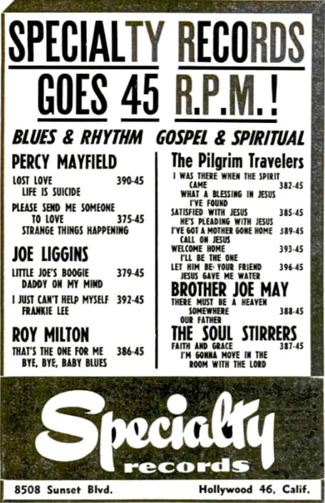 HOLLYWOODArt Rupe, topper of Specialty Records swung his firm into production of 45 rpm discs in answer to increasing demands from the trade. All future Specialty releases will be waxed on both 45 and 78. Initial batch of tunes to be issued on 45 include "Lost Love" by Percy Mayfield, "Little Joe’s Boogie" by Joe Liggins, "That’s The One For Me" by Roy Milton, and a group of gospels and spirituals by the Pilgrim Travelers, Brother Joe May, and the Soul Stirrers.THE BILLBOARD, November 25, 1950: