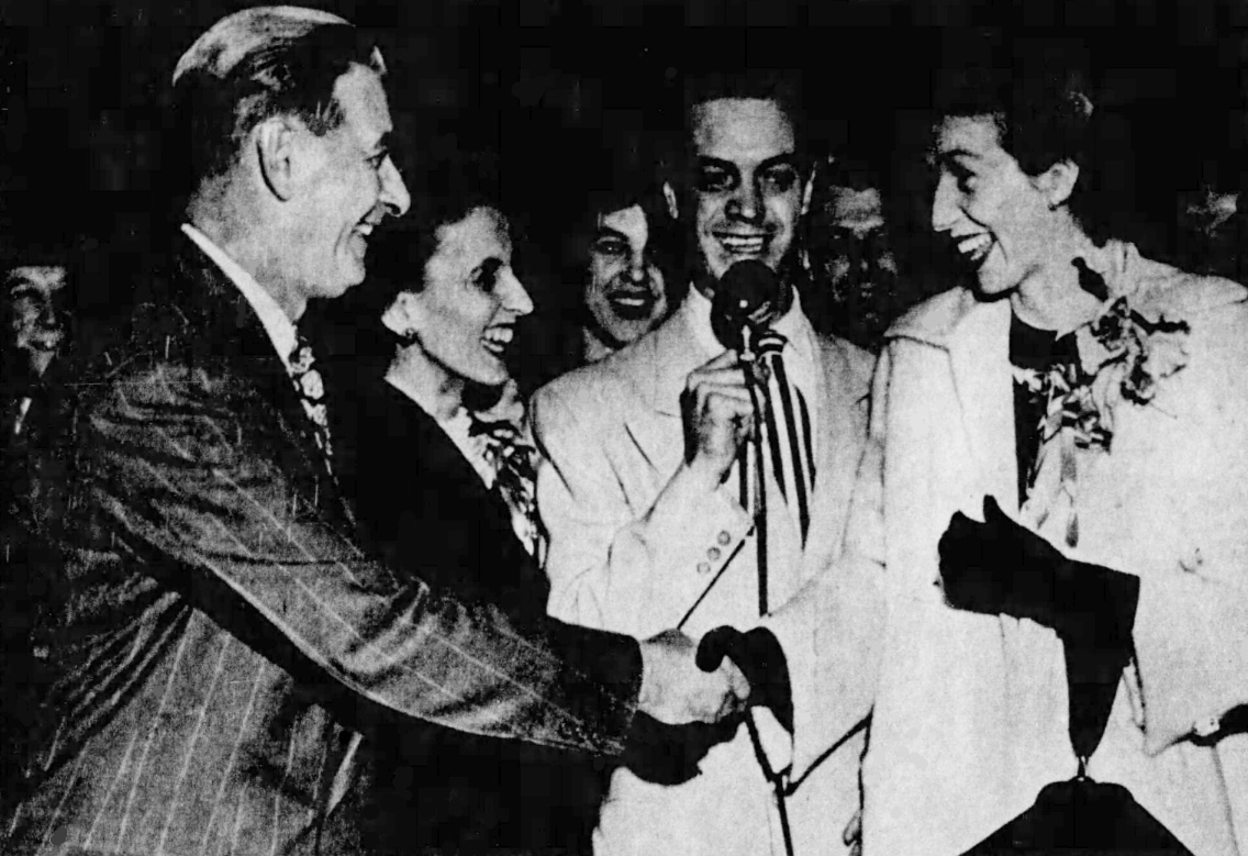 Mayor Charles E. Slusser, extreme left, greeted "Miss Cinderella" before the party. Also on hand were Miss Offineer, second from left, and Alan Freed, holding the microphone, who emceed the show. (NOTE: Miss Cinderella's name is Mrs. Thomas Porosky. She won the WAKR contest by correctly naming the "mystery princess", who was Bea Offineer. The full page article never does give Mrs. Porosky's first name.)