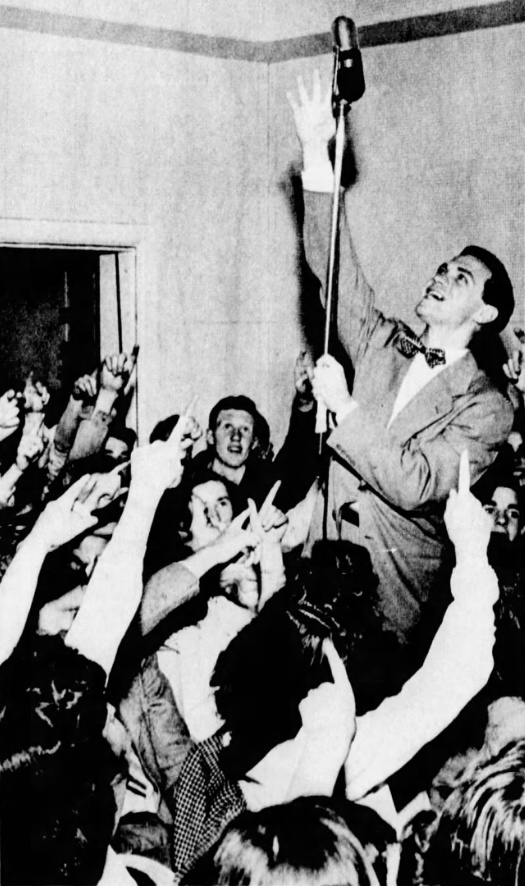 (NOTE: Singing along with the records carried over when Freed switched to rhythm and blues on WJW and WINS.)Strickly an ad-lib worker, Freed has made "My Father's Mustache" a local by-word. Side remarks deal with such characters as "Little Dale" and "Danny Boy" with "The Londonderry Hair" thrown in for puns-sake. Many a Hollywood star would envy Alan his fan mail, which averages about 500 letters and postcards a day plus telegrams and special delivery epistles.