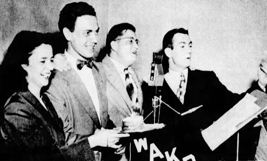 It was Alan Freed's first anniversary on "Request Review". The cast feted him with a one-candle power cake. They are, from the left, "Little Dale" Hinton, program stenographer; Freed; "Danny Boy" Silverman, the engineer; and Dean Glass, producer.