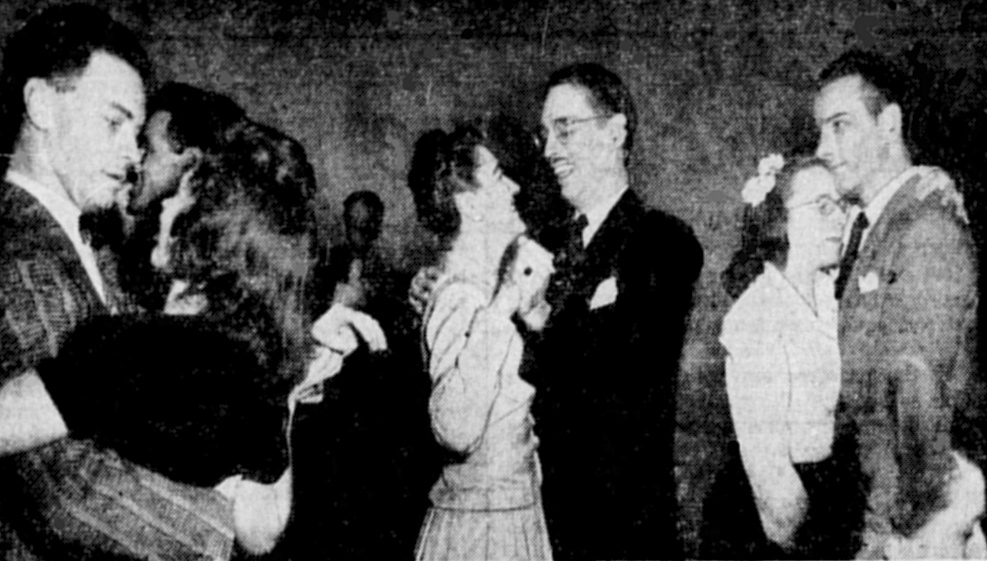 Staff members of radio station WAKR took time off last night to enjoy their annual Christmas-week dinner and dance at the Mayflower Hotel....Alan Freed, left, danced with Mrs. Freed to the music he has helped make popular via his disc jockey show.. Also enjoying the music were, Doris Phelps and Robert Hollister, center, and Ted Johnson and Mrs. Johnson, right.