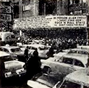 .... Speaking with Alan Freed backstage at the Brooklyn Paramount, he was reminded of the days when the parents of today stormed the Paramount to hear Tommy Dorsey swing it or to swoon over a Frank Sinatra ballad. "We were criticized then, just as the dungaree brigade is today", he said. "I can recall insisting on doing my homework with a Benny Goodman record going. Invariably, my mother would open the door of my room and command 'Will you please turn that noise off!'"Rock 'n' roll, according to its chief ambassador, had to happen. "Jazz got so far out, it lost its beat and the bands became conscious of new sounds, forgetting people still like simple melodies. For 10 years the kids were starved for music they could dance to".