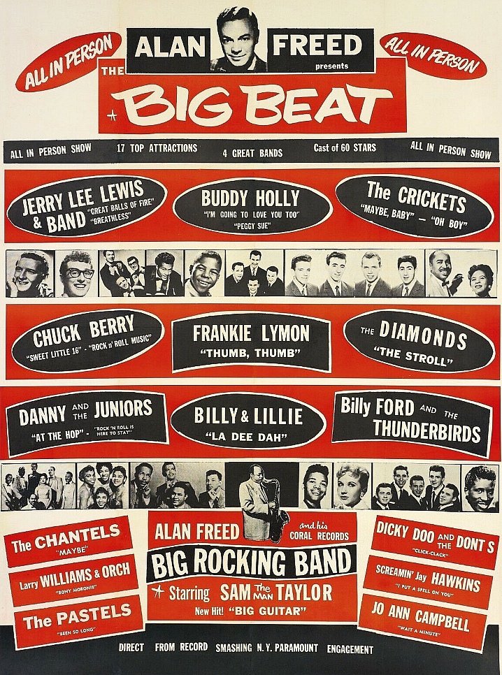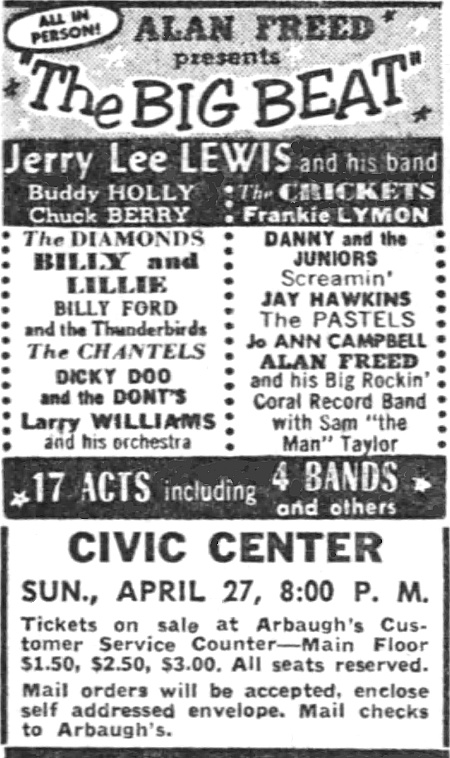 Alan Freed (top) and his all new 2 1/2 hour stage revue "The Big Beat", with a cast of 65, will appear at the State Theater Sunday, March 30, for one day only. Headlining will be Jerry Lee Lewis and his Band, famed for "Breathless"; Buddy Holly singing "Peggy Sue"; the Crickets with "Maybe Baby"; Chuck Berry with "Sweet Sixteen"; and Billy and Lillie with "La Dee Dah".Also appearing will be Frankie Lymon, the Diamonds, Danny and the Juniors, the Chantels, Dicky Doo and the Don'ts, Larry Williams, the Pastels, Screamin' Jay Hawkins, Jo-Ann Campbell, the Thunderbirds, and the Big Alan Freed Band with Sam "The Man" Taylor.