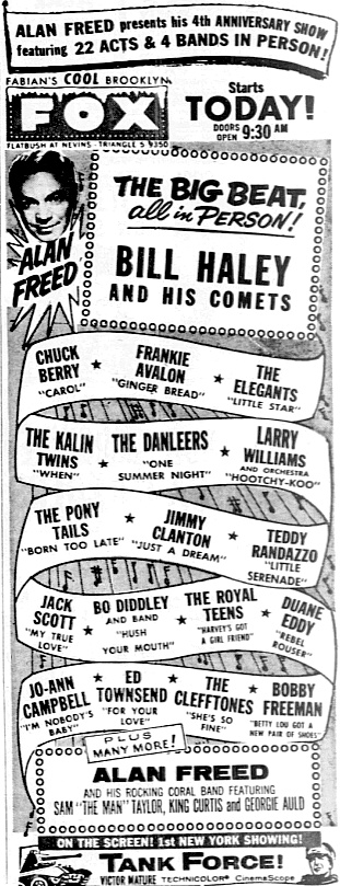 NEW YORKWith Easter drawing near, Alan Freed goes into the Brooklyn Paramount with an imposing lineup that includes Charlie Gracie, Buddy Knox, Jimmy Bowen and the Rhythm Orchids, the Cellos, the Cleftones, Bo Diddley and his Band, Billy Mason and the Rhythm Jesters, Anita Ellis, The G-Clefs, the Pearls, the Heartbreakers, Bobby Marchan, the Harptones, the Rosebuds, the Solitaires, the Four Joes, and Freed's own big Rock 'n' Roll Band featuring Sam (The Man) Taylor, Big Al Sears, Freddie Mitchell and Panama Francis....