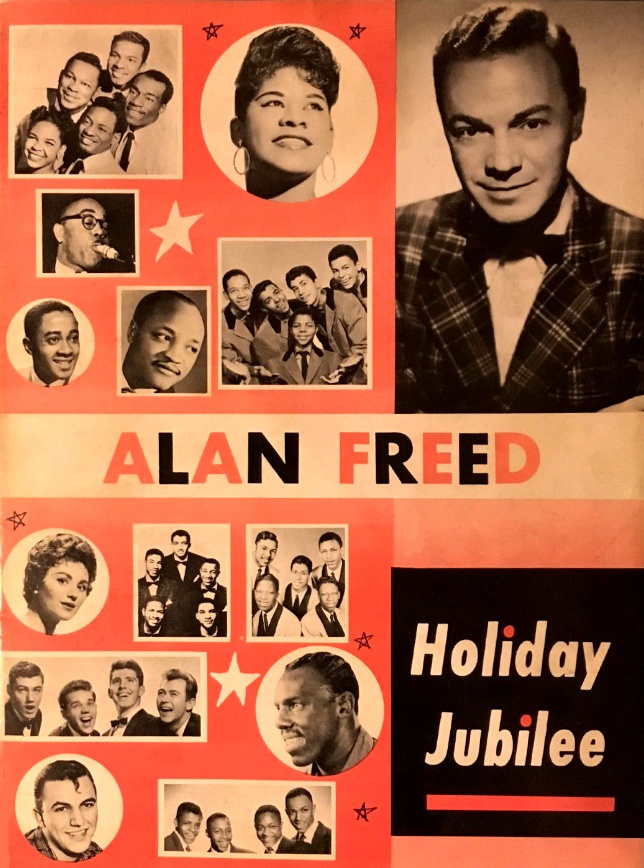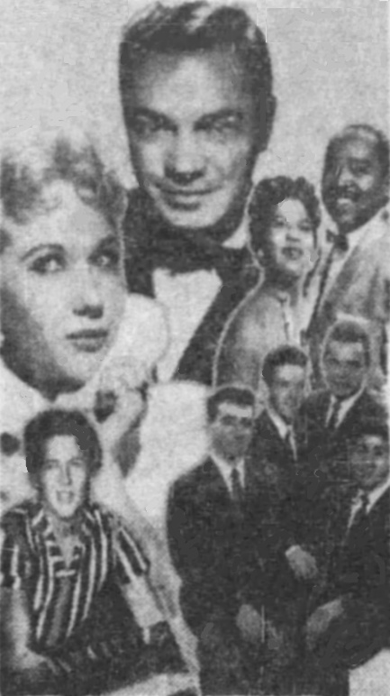 Alan Freed (top center), billed as "The King of Rock 'N' Roll", and his outstanding "Holiday of Stars" revue with 55 top entertainers is being presented at the State Theater for the last times today.Headline attractions include Chuck Berry with his big hit "Rock 'N Roll Music"; Bill Justis and Band, famed for "Raunchy"; Lee Andrews and the Hearts, recording stars of "Tear Drops"; and the Moonglows, singing "The Beating of My Heart". Also appearing is Jo-Ann Campbell, offering her popular favorites including "Wait A Minute"; the Dubs with "Could This Be Magic"; the Twin-Tones, who skyrocketed to fame with "Jo-Ann"; and the Sparkletones with "Penny Loafers and Bobby Sox".