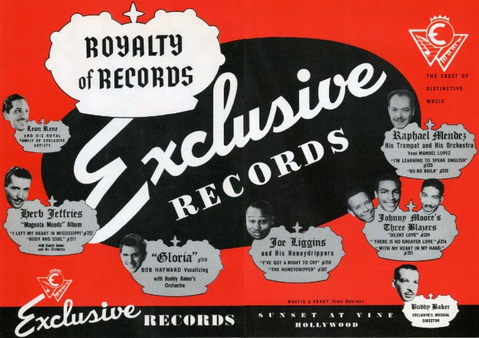 Above: Full two-page clipping from Billboard Music Yearbook 1946. Exclusive, located in Hollywood, was owned by Leon René. General Sales Manager was Franklin Kort and Musical Director was Buddy Baker. Leon's brother, Otis, owned the Excelsior label.