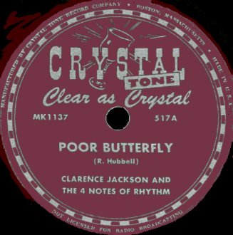 Above: Crystal Tone 517A Label released in March 1948 (the flip does not have vocal harmony). This was a Boston label, owned by Manny Koppelman, which also produced some releases by Sabby Lewis And His Orchestra, another Boston area attraction. "Poor Butterfly" is a classic song (composed in 1916) which has been done by various artists, including The Flennoy Trio in 1945.Click on an option below to listen to Clarence Jackson And The 4 Notes Of Rhythm sing "Poor Butterfly" using Windows Media Player. [Audio restoration by Dave Saviet.]