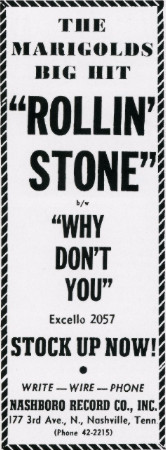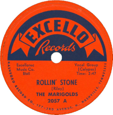 Above: Label image for Excello 2057 A. "Rollin' Stone" was a hit for them, heavily played on Alan Freed's radio show in NYC. The Marigolds had four releases on Excello (1955-56) plus another as by The Solotones (1955).