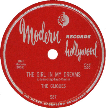 Looks like Modern Records has another big act in a new group recently signed, the Cliques. First wax effort by the lads, "The Girl in My Dreams," is getting great jockey reaction and is taking off nationally. Modern also has another new group, the Phantoms, who cut their first wax last week....