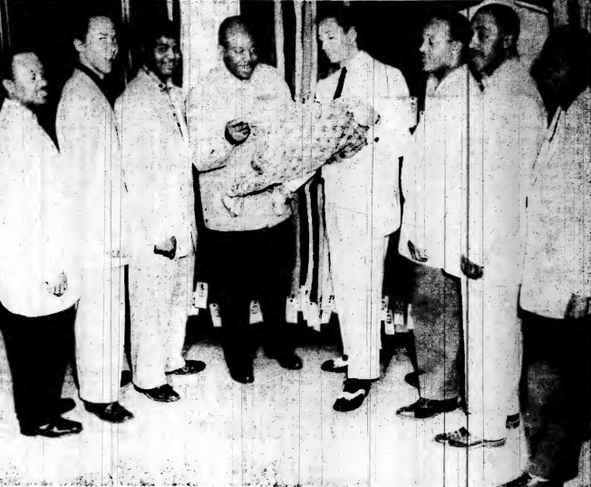 Above: From California Eagle dated 4/7/55: "TAYLOR MADE PARADE—Charles of Charles Ltd., fabulous downtown Los Angeles men's clothier, shows bandleader Roy Milton and his Solid Senders orchestra garments he created for the band's new uniforms. Two complete sets were styled and delivered by Charles this week in time for the group's Easter parade dance. Pictured, left to right, Charles Gillum, Jack Kelson, James Daun, Roy '5-4' Milton, Charles Lawrence Cato, Floyd Turnham, Clifford Scott."