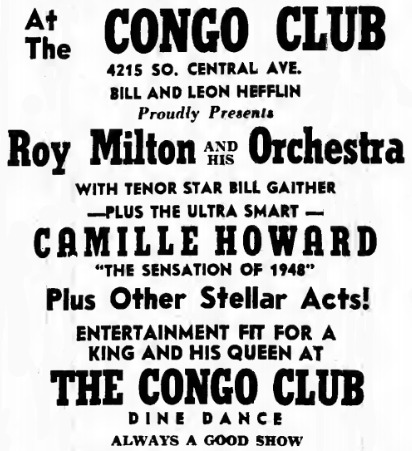 Above: From California Eagle dated 6/17/48. Bill Gaither was Milton's tenor sax player at the time. The Congo Club was located in Los Angeles.