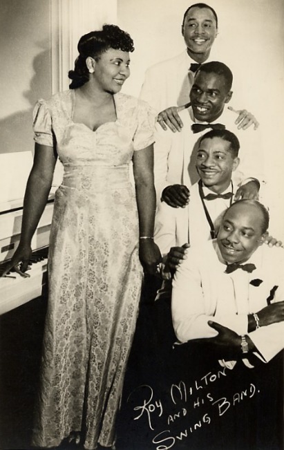 Above: Photo of Roy Milton And His Swing Band. Camille Howard is at left and Roy Milton at bottom right. Howard, known as "The Boogie Rhythm Gal" for her boogie woogie piano playing, was a star in her own right. (2/4/15): The man second from the top is David Robinson, bass player, as identified by his daughter Deborah Wong.Click HERE for an article about Roy Milton by J.C. Marion.